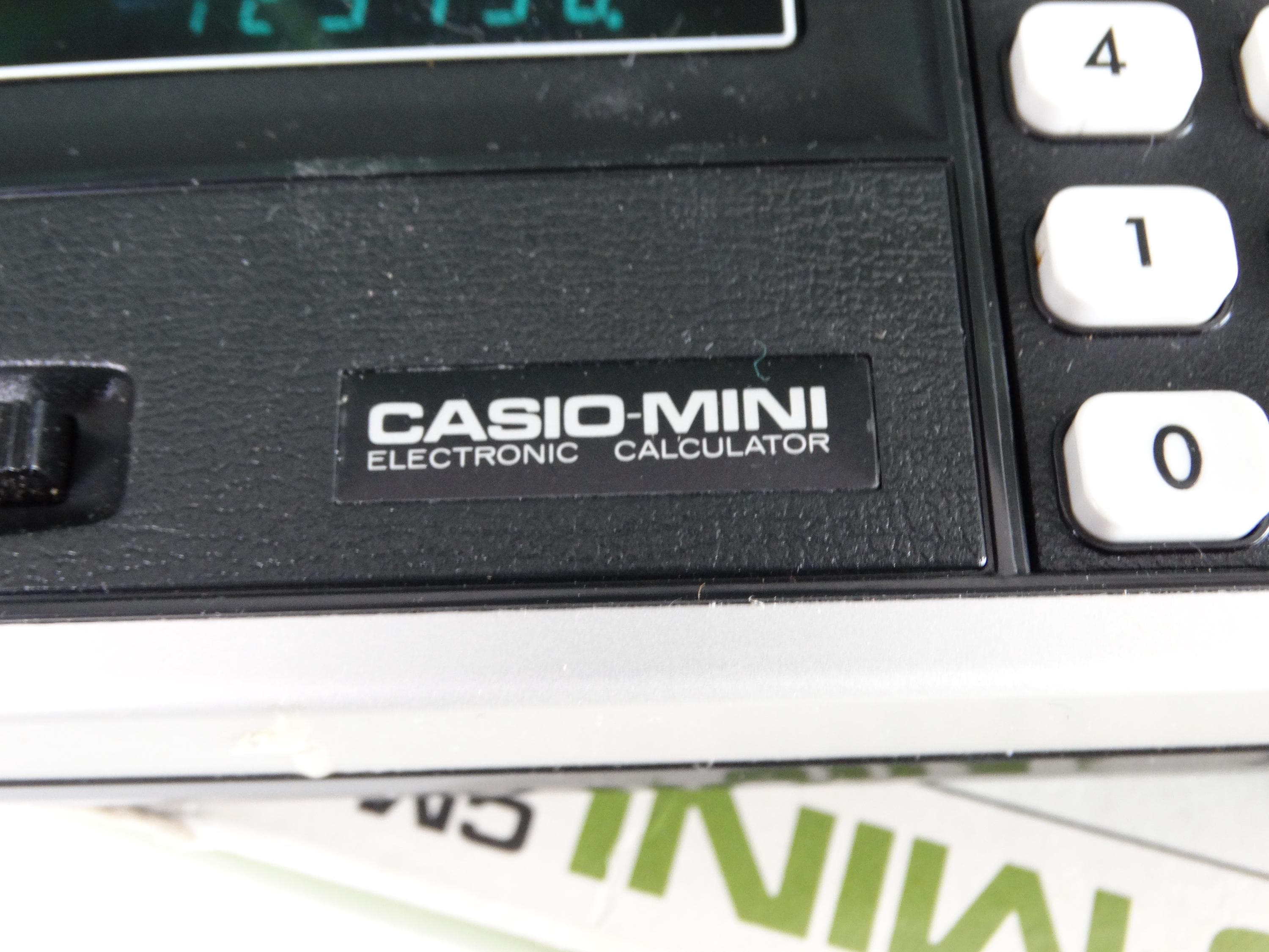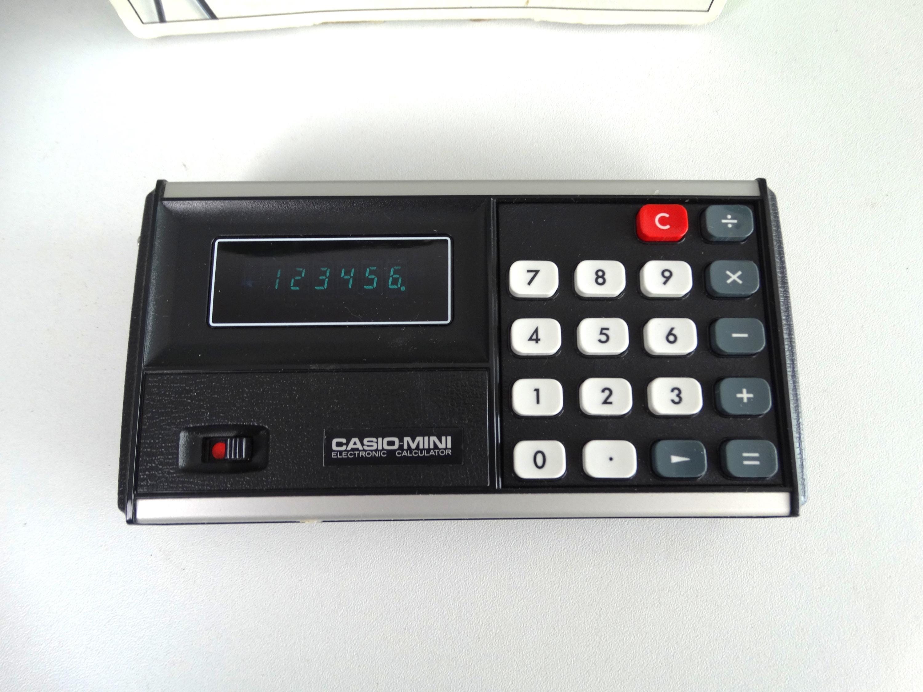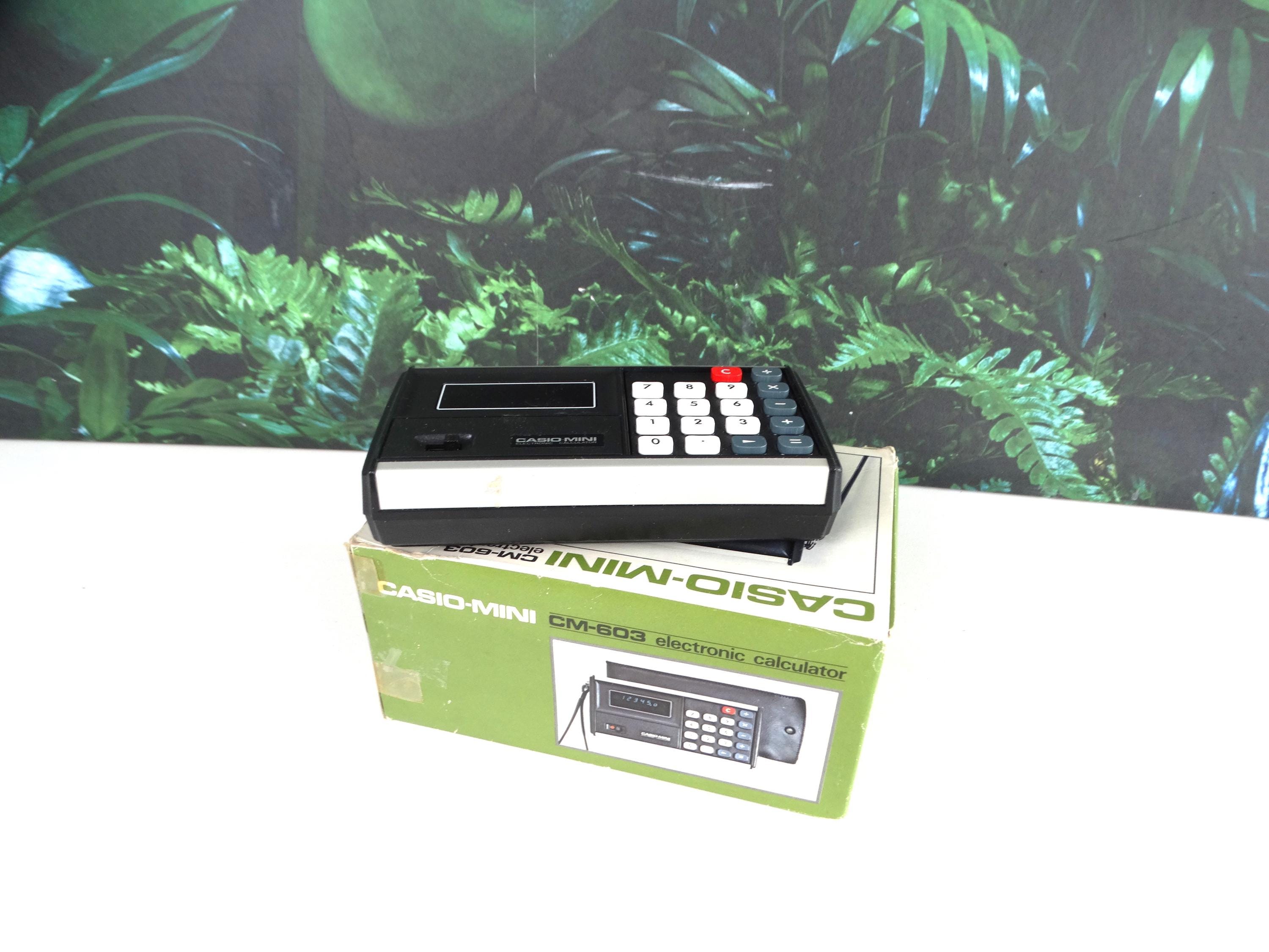 Vintage CASIO-MINI electronic calculator CM-602. Manufactured by CASIO Computer Co., Ltd. (Japan) in 1972. Operates on 4 x 1.5 V AA batteries and can also be used with an AC adapter AD-4145. This calculator was one of the first affordable, portable calculators and played a significant role in popularizing such devices for personal use. Batteries and a black leather case are included.