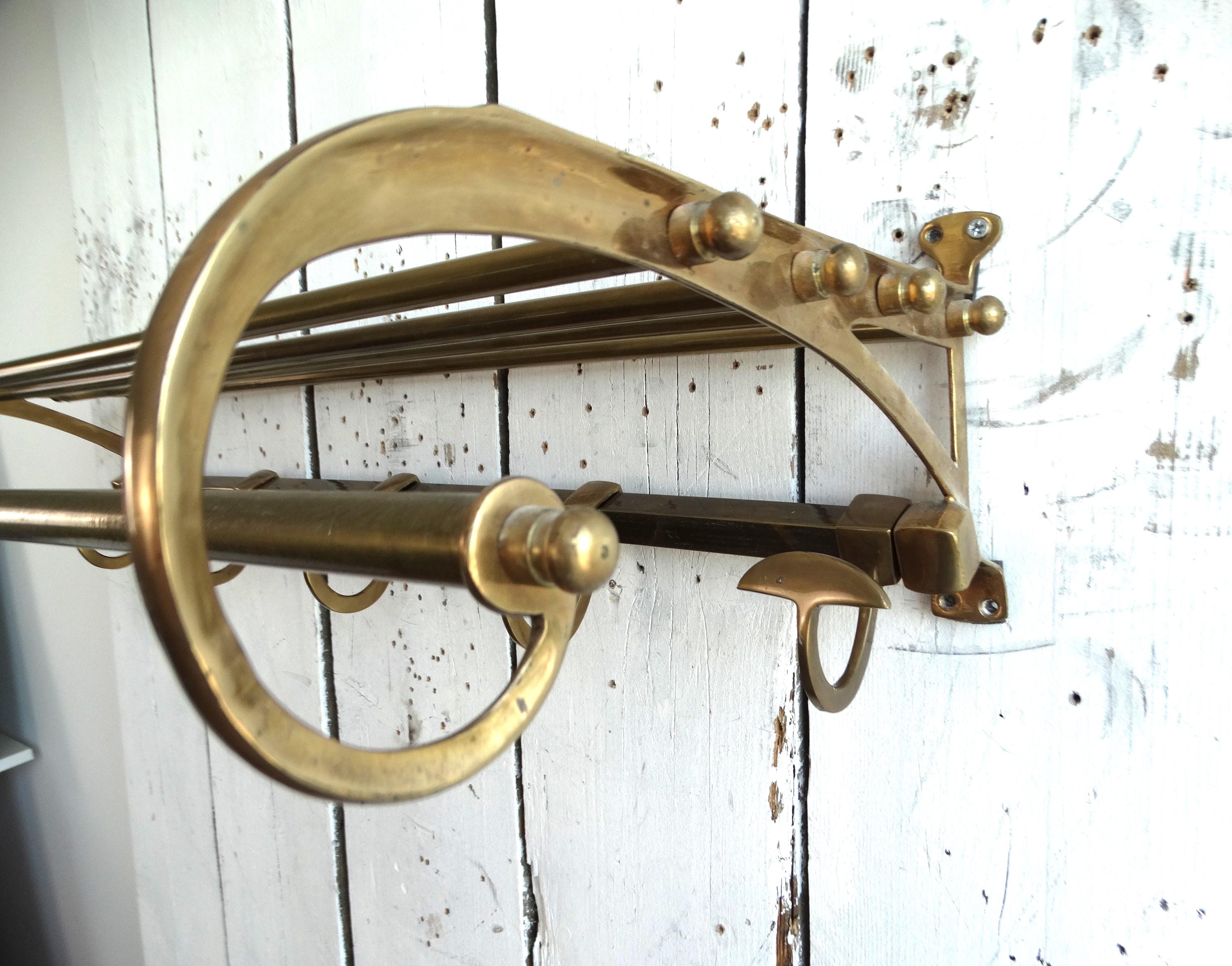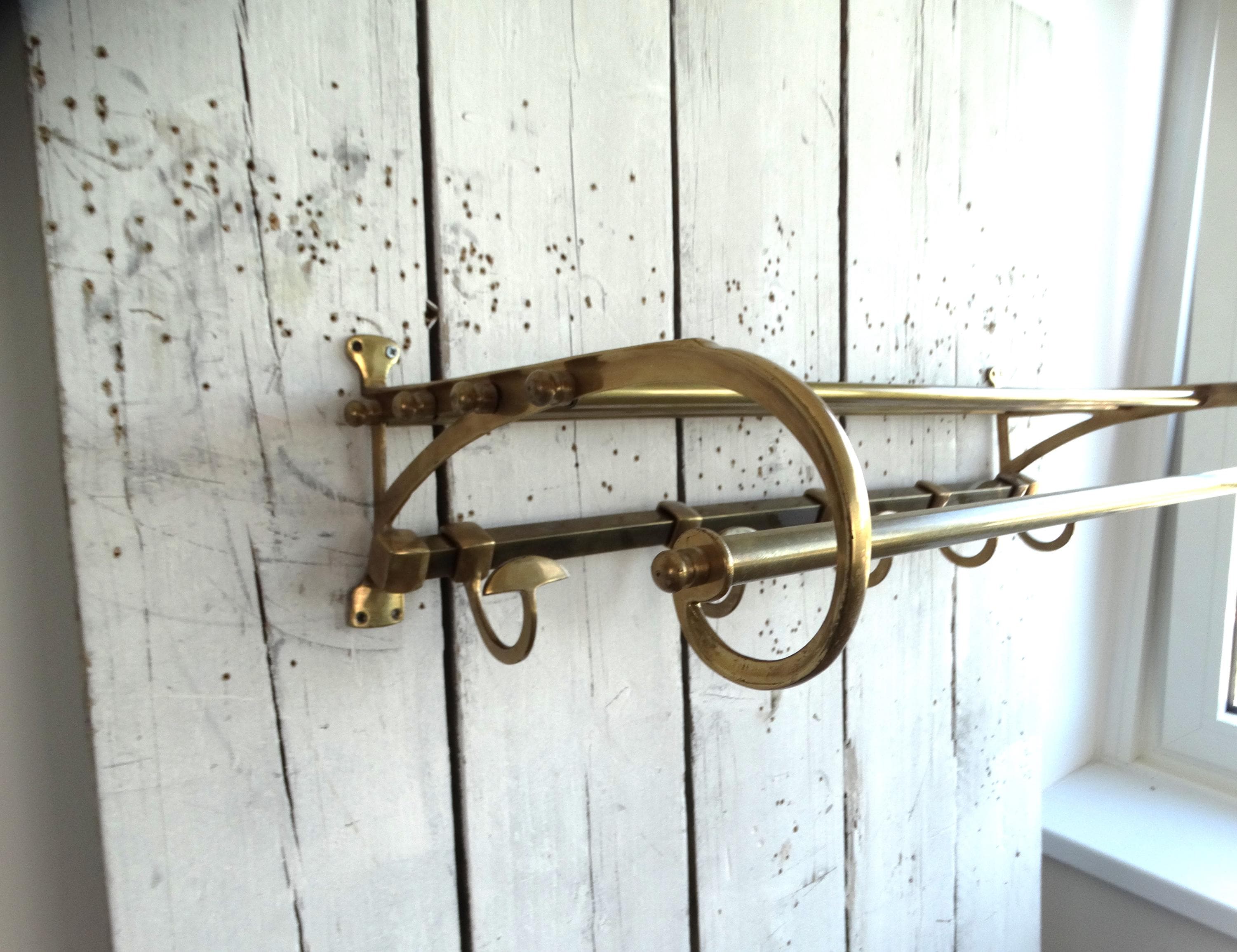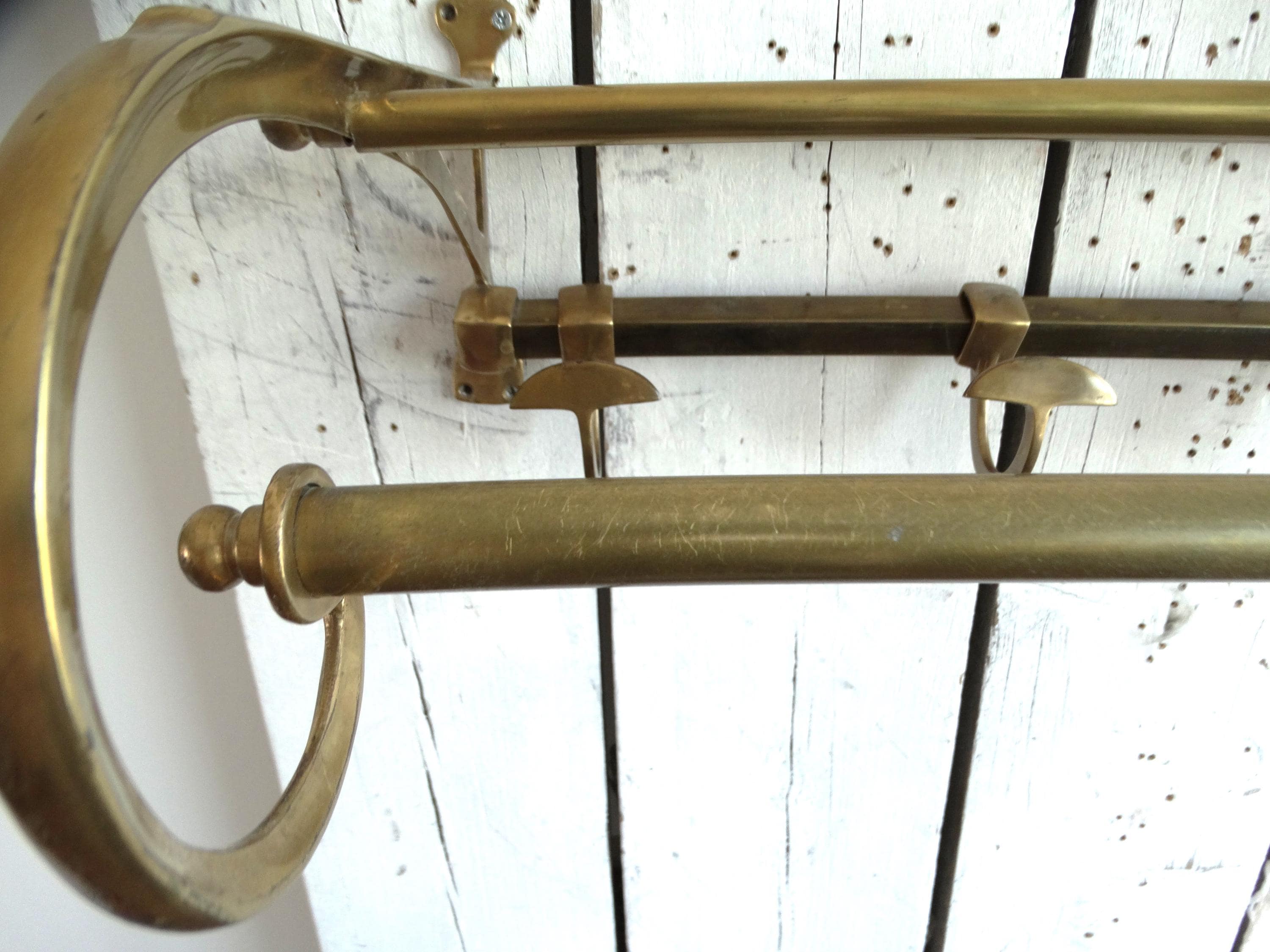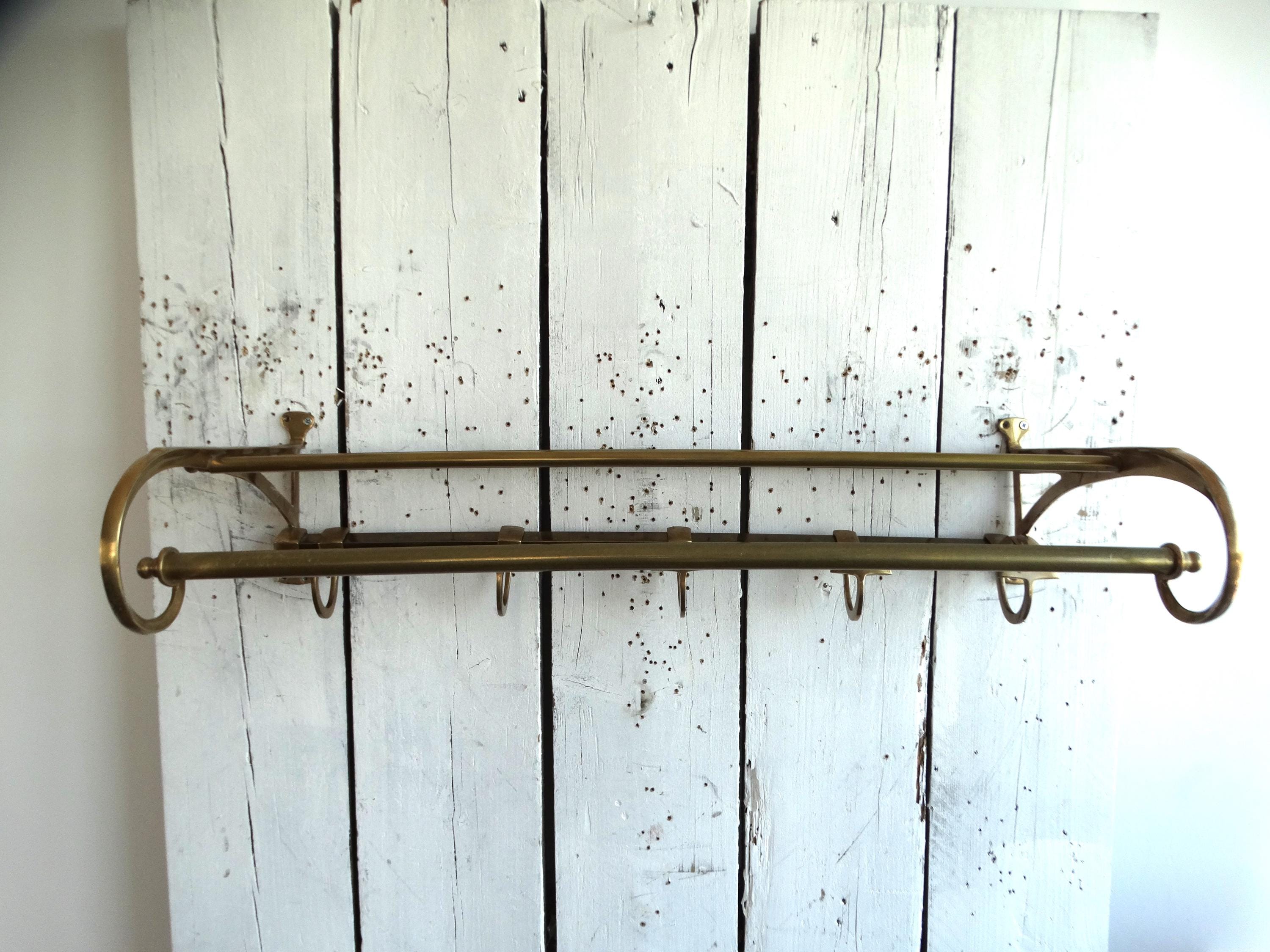 This coat rack is beautifully decorated and detailed with elegant knobs and beautifully shaped, sliding coat hooks. The hat shelf is formed by four round tubes, and the tube to which the hooks are attached is round. A total of five coat hooks.